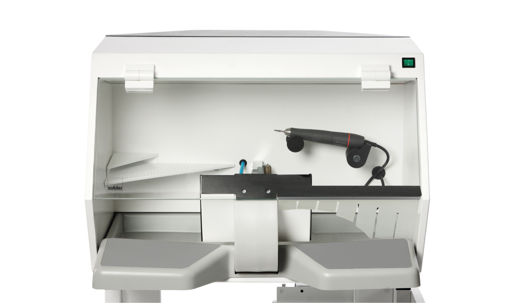 Sowohl Qualität als auch Quantität sind Grundvoraussetzung für ein ökonomisch arbeitendes Labor. Dies fängt in der Regel bei der Arbeitsvorbereitung an. Hier wird der Grundstein für eine qualitativ hochwertige Arbeit gelegt. Deswegen wurde bei der Arbeitsvorbereitungsbox aus dem Hause Zubler besonders viel Wert auf Ergonomie, Sauberkeit und Effizienz gelegt. Durch eine integrierte Abblasdüse, die durch einen Fußschalter betätigt wird, können Gipsmodelle in der Box freigeblasen werden. Schutzscheibe und Arbeitsblock können nach oben weggeschwenkt werden. Durch Abziehen des Trichters lässt sich die Auffangwanne herausnehmen und bequem säubern.